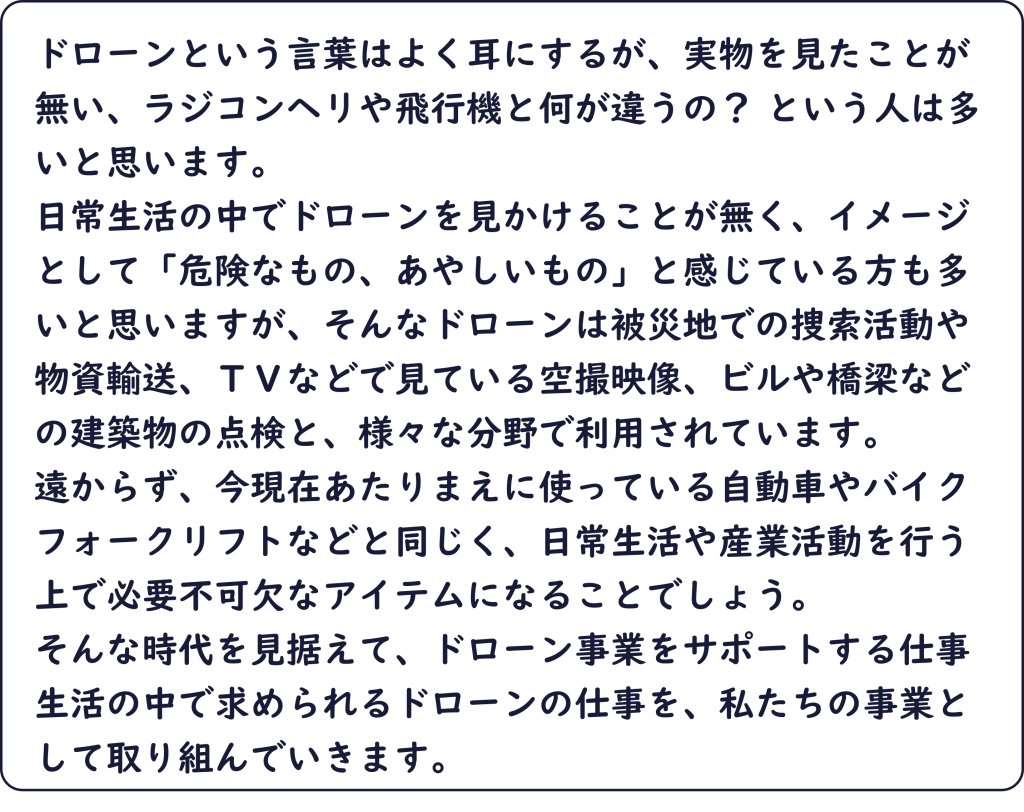 ドローンを飛ばす仕事から、ドローン事業をサポートする仕事まで行います。
